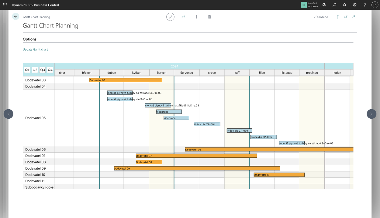 Ganttův graf plánování subdodávek projektu v Microsoft Dynamics 365 Business Central