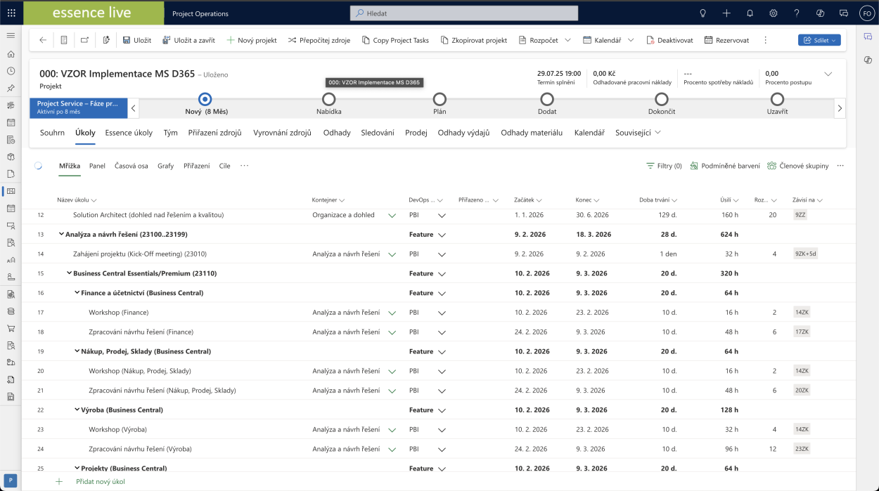 Plánování projektů, úkolů a zdrojů v Microsoft Dynamics 365 Project Operations integrovaném s Business Central