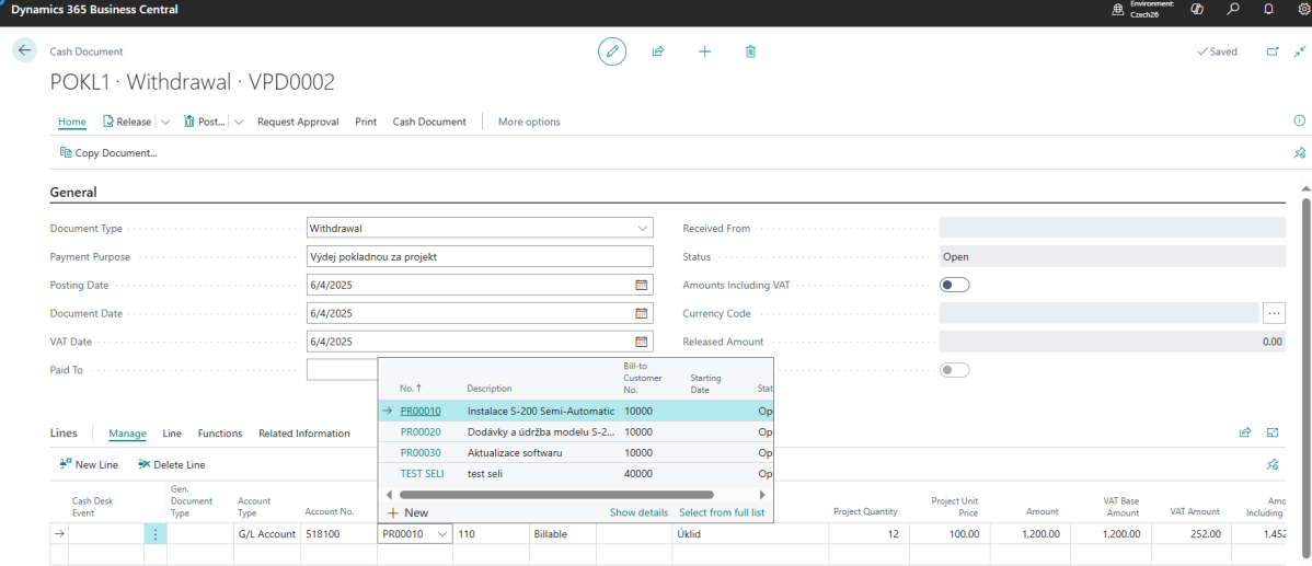 You can now assign a project number and a specific task directly when entering a cash document. This ensures more accurate cost allocation without the need for later corrections.